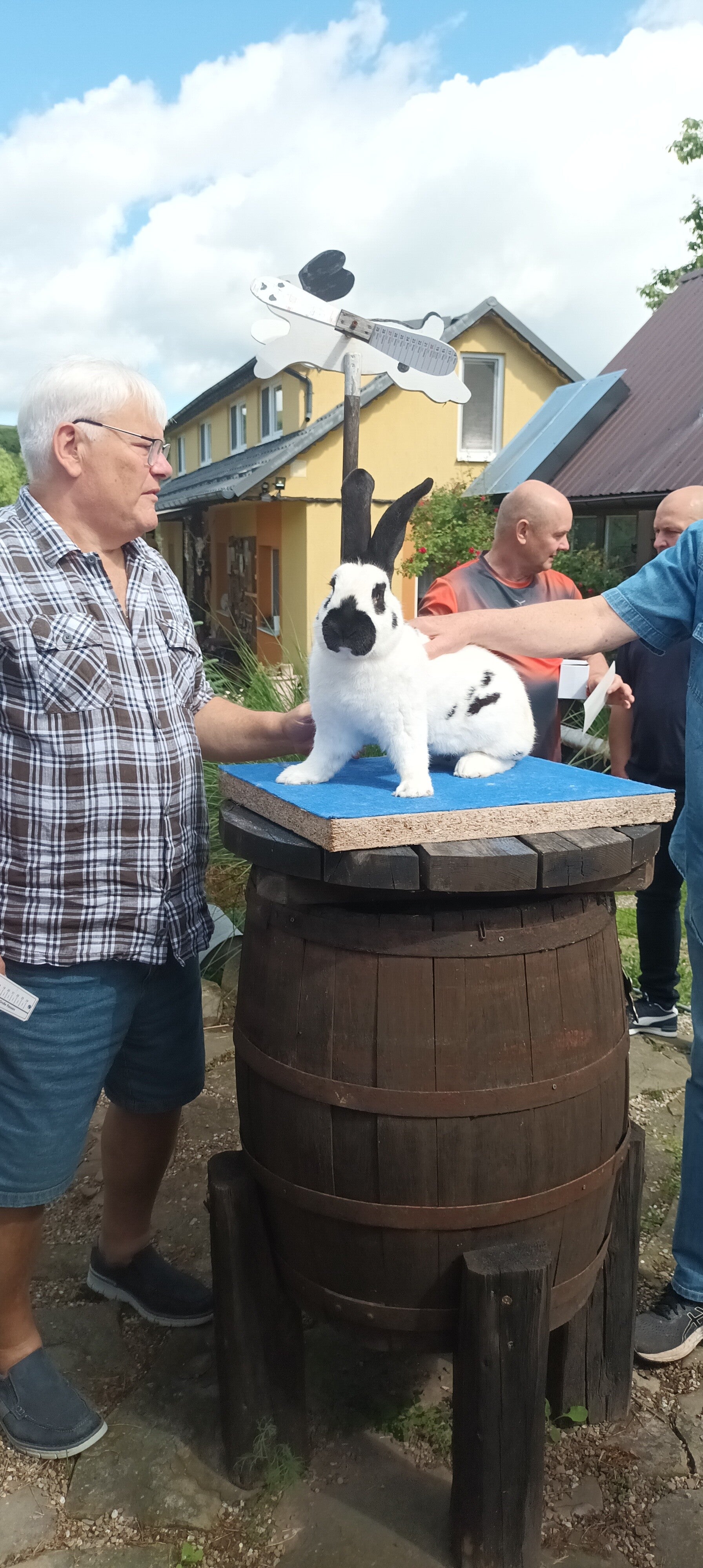Jetzt ging es zu Zdenek Klima der uns auch über die ganze Zeit mit seiner Familie sehr gut und immer freundlich mit allem versorgte, es fehlte uns in diesen Tagen nichts und dafür nochmals an euch alle ein aufrichtiges Dankeschön. Zip bekamen von Zdenek seine Riesenschecken blau -weiß präsentiert. Zip sahen Tiere in sehr schönem Grösenrahmen und kräftigen Läufen mit schönem Katzentritt. Auch die Ohren passten zum Größenrahmen. Die Felle konnte man eigentlich zum sommerlichen Zeitpunkt nicht richtig und objektiv beurteilen. Bei dem Kopf und Rumpfzeichnung war es wie bei vielen Schecken Züchter sehr schöne und weniger schöne obwohl man sagen kann, die meisten davon waren Ausstellungstauglich. Auch die Farben waren recht gut.