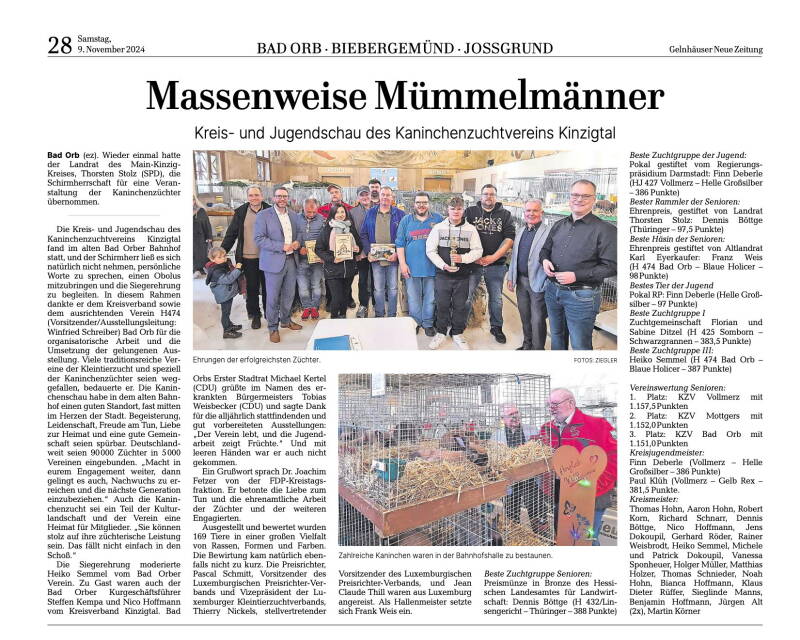 Mit Geldspenden für die Ehrenpreise brachten sich auch das Land Hessen sowie Landrat Thorsten Stolz und Landrat i.R. Karl Eyerkaufer ein. Im Anschluss an die Begrüßungs- und Dankesworte Winfried Schreibers, die 'auch der Stadt Bad Orb galten, bedankte sich der Schirmherr, Bürgermeister Tobias Weisbecker, dass die Kaninchenzüchter Jahr für Jahr das Veranstaltungsprogramm mit einer tollen Ausstellung bereichern. Er lobte die von den Preisrichtern ausgezeichneten Ergebnisse und freute sich bereits auf 2024, wenn der Verein wieder eine so toll organisierte Veranstaltung präsentieren wird. Christoph Degen (SPD-Landtags-abgeordneter und ehrenamtlicher Präsident des Hessischen· Musikerverbandes zollte dem ehrenamtlichen Einsatz Respekt. Es sei auch wichtig.in der Jugendarbeit zu vermitteln, das gerade, die Tierhaltung mit besonderer Verantwortung verbunden sei. Schmunzelnd fügte er hinzu, dass er gesehen habe, dass auch" Rote Neuseeländers" ausgestellt waren. Dann bin ich auf jeden Fall nicht der einzige Rote hier.